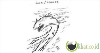 seperti hiu dengan tanduk di kepalanya serta memiliki tiga buah ekor dan